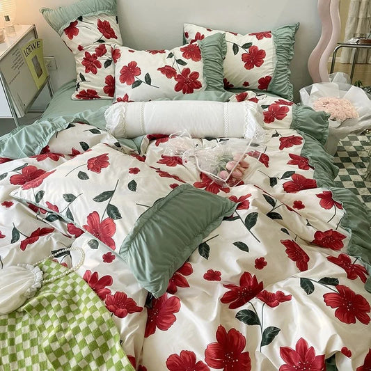 Romantic Flower Lace Bedding Set with Ruffles for Girls and Women Sets Full Bed Sheets Quilt Comforter Duvet Complete King Size