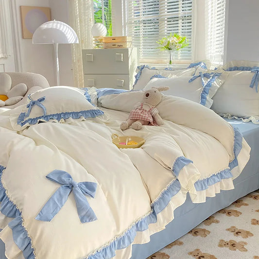 Princess Korean Style Bedding Set with Bow Pink Blue Girls Double Queen Size Duvet Cover No Filling Flat Sheet Pillowcases Kit