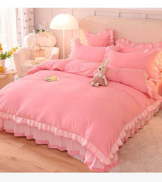 Pink Princess Girls Ruffle Lace Bedding Sets Luxury Quilt Cover Bed Sheet and Pillowcases Soft Bedclothes Decor Home